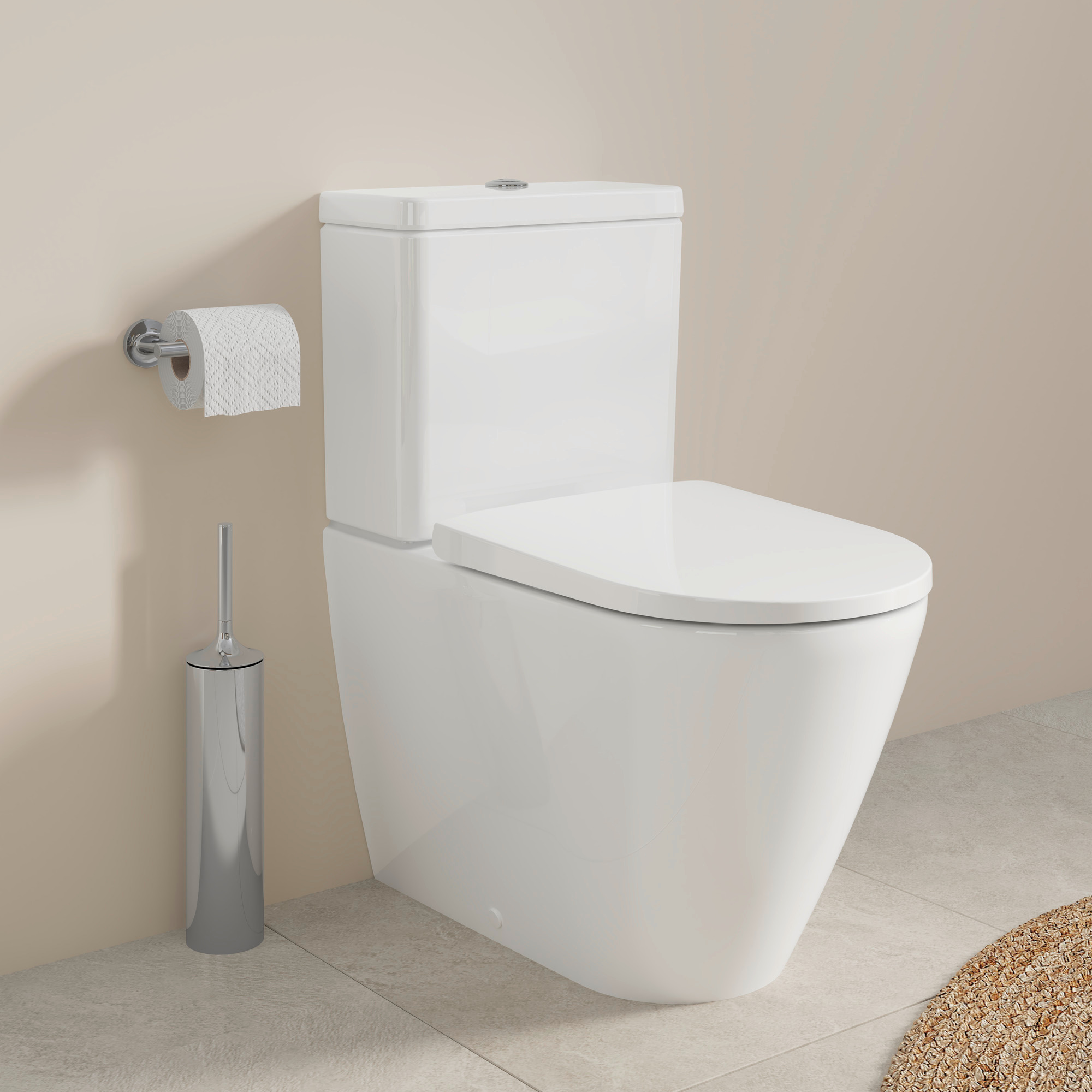 Komplett toalettpaket inklusive mjukstängande sits (softclose) och variabla anslutningsdelar för golv- eller väggavlopp.