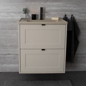 Naven 600 tvättställsskåp från LH. En unik och svensktillverkad badrumsmöbel med två stycken släta fronter. Med inspiration från lokalt hantverkskunnande erbjuder möbelserien Naven en möjlighet utöver det vanliga att inreda ditt badrum.